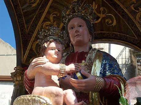 La storia - Si riuscì infine a costruire il Santuario che però fu distrutto, come del resto l’intero centro abitato, dal catastrofico terremoto del 1693. Crollò ogni cosa ma il dipinto rimase miracolosamente integro. Buscemi fu ricostruita in un nuovo sito, ma, il Santuario fu riedificato nel luogo in cui si trovava, lo stesso in cui è ubicato attualmente. Intorno alla fine del XVIII sec. Fu realizzata una statua somigliante al dipinto e nel 1919 esattamente il 18 Maggio, la Vergine, denominata “MADONNA DEL BOSCO”, venne proclamata, per voler del popolo, patrona di Buscemi. Il suo Santuario, situato a circa un chilometro dal centro abitato, è meta di numerosi fedeli, i quali, in prossimità dei festeggiamenti che si svolgono all’ultima domenica di agosto, usano compiere il cosiddetto “Viaggiu scausu”, partendo dalle proprie abitazioni, sino ad arrivare al Santuario pregando la Madonna. Durante i tre giorni che precedono la festa, al Santuario vi sono solenni celebrazioni liturgiche, mentre in paese si tengono spettacoli d’intrattenimento.
